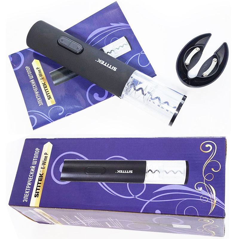 Технические характеристики: Скорость извлечения пробки из бутылки — 9 сек. Скорость освобождения штопора от пробки — 8 сек. Управление — двухпозиционный переключатель. Питание — 4 батарейки типа «АА». Ресурс одного комплекта батареек — 40 бутылок. Материал корпуса — ABS-пластик. Габаритные размеры — 25,5 х 5 см. Вес штопора — 352 г. Цвет корпуса — черный. Комплект поставки: электроштопор для вина «SITITEK E-Wine P»; нож для удаления фольги с горлышка бутылки; инструкция по эксплуатации.