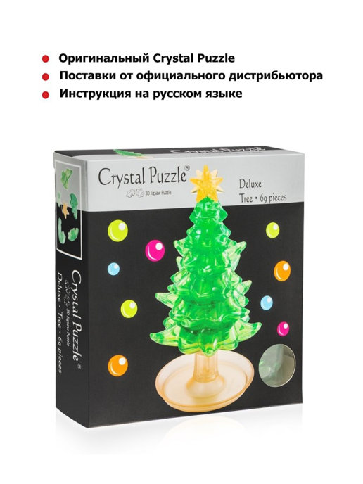 Объёмная елочка придётся по вкусу как новичкам, так и опытным фанатам головоломок. Классическая форма ёлки хорошо подходит для того, чтобы научиться сопоставлять детали в трёхмерном пространстве. Готовая модель станет необычным подарком или удачным пополнением коллекции. На макушку ёлки можно установить кристальную звезду, которая входит в комплект. В комплект также входит инструкция на русском языке, где для каждой детали указан номер. Чтобы облегчить себе задачу, разложите детали по номерам и соединяйте одну с другой. Но самый интересный способ — подбирать части пазла согласно их форме и размеру, учиться определять место для каждой детали в трёхмерной фигуре.