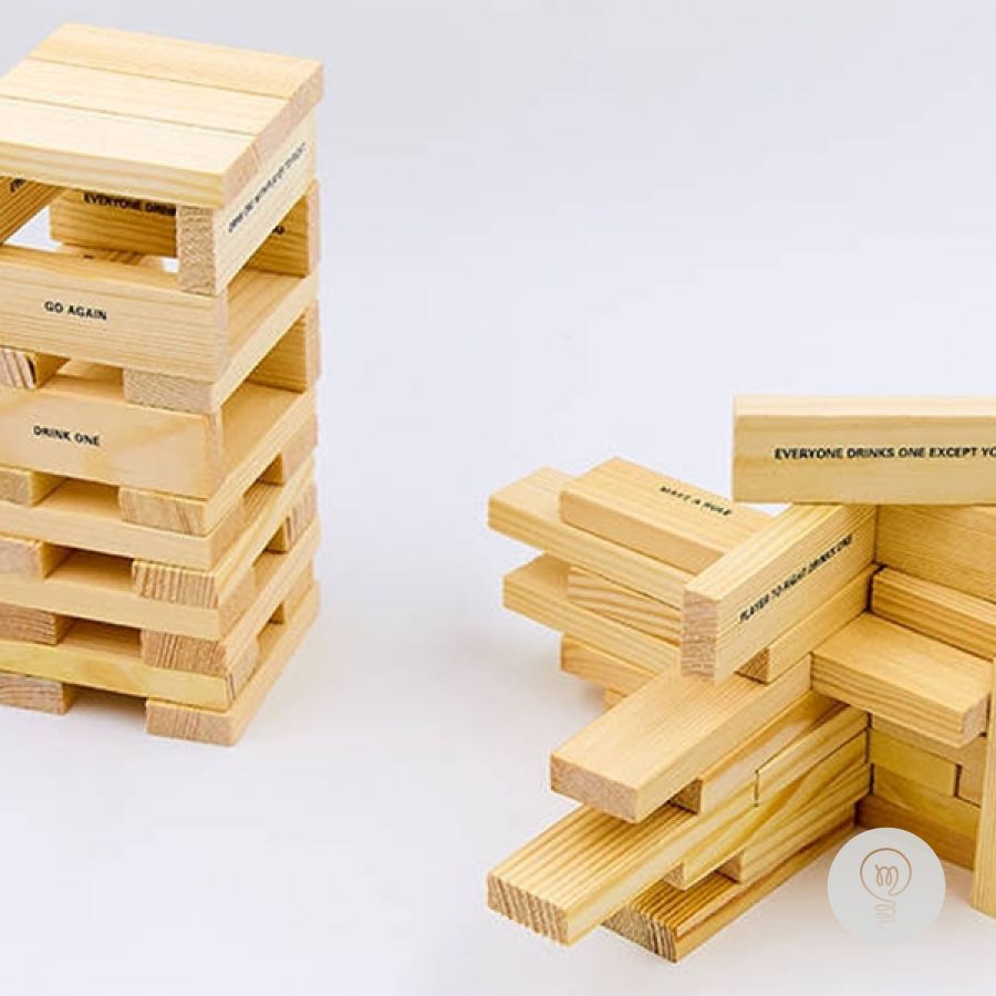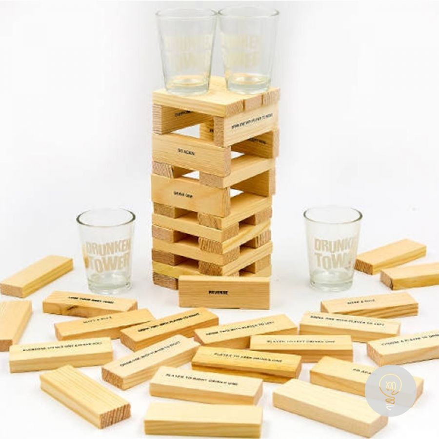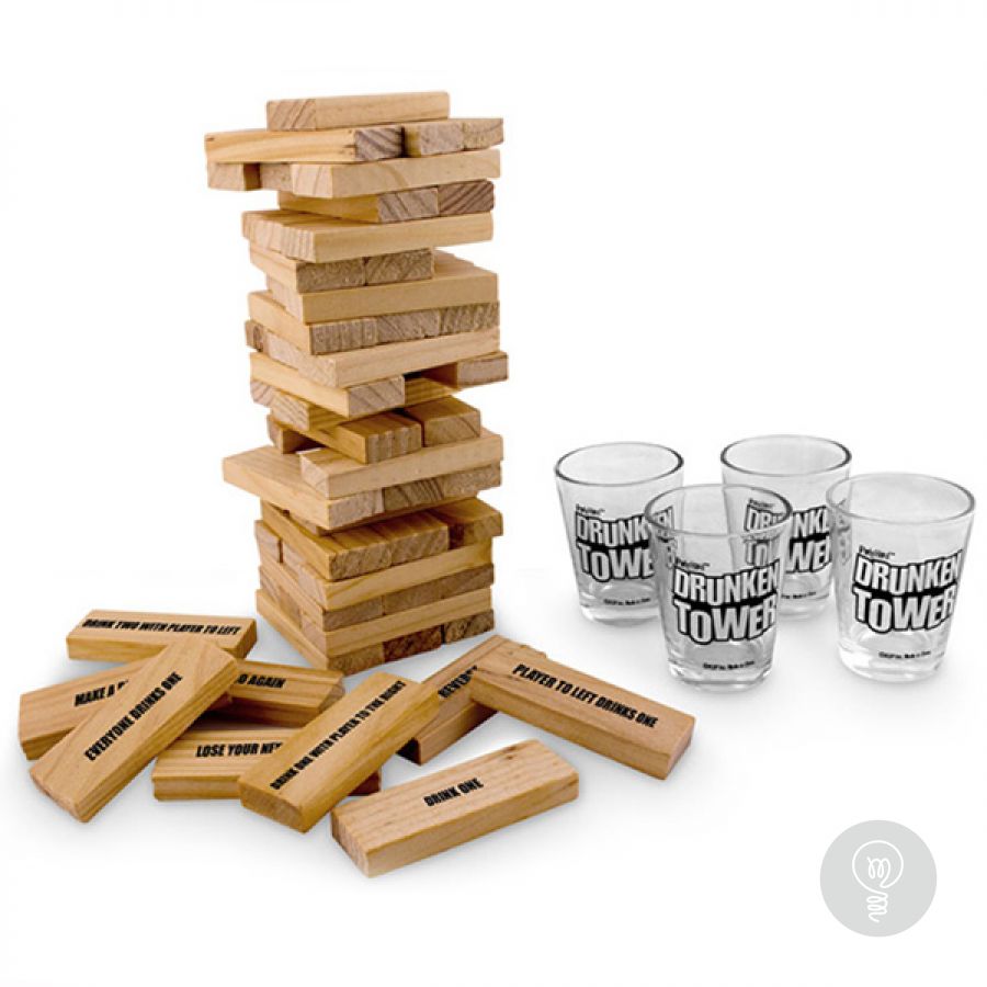 Популярная игра Дженга теперь снабжена стопками и даёт возможность проигравшему компенсировать свою неудачу рюмкой бодрящего напитка. Правила игры просты. На первом этапе из брусков строится башня (в каждом уровне 3 бруска, на каждый следующий уровень бруски кладутся перпендикулярно предыдущему). Далее игроки по очереди вытаскивают бруски из основания башни и кладут их сверху, делая башню всё более высокой и все менее устойчивой. Можно предварительно проверять бруски на устойчивость положения, так же можно передумать и оставить на месте уже слегка вытащенные бруски. Касаться башни при этом разрешается только одной какой-либо рукой. Проигравшим считается тот, чей ход обрушит башню. Ему и наливают штрафную.