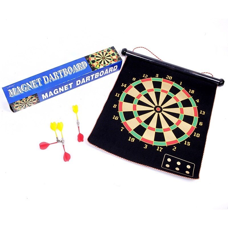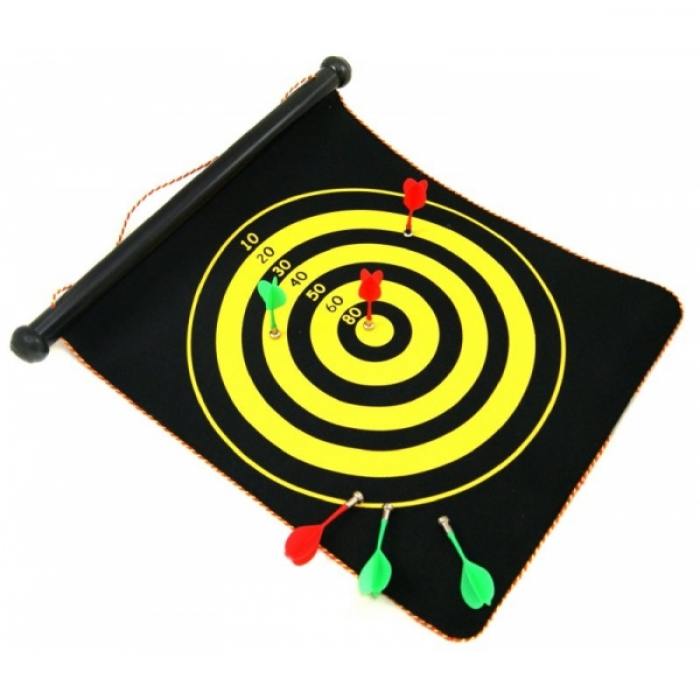 Компактный набор для игры в дартс, благодаря тонкому магнитному полю, легко сворачивается в трубочку. Такой рулончик удобно брать с собой для игр на свежем воздухе, но и для офисного перерыва или для конкурса на вечеринке он тоже подойдёт. Магнитные дротики обеспечат безопасность всем игрокам. В комплекте 6 дротиков двух цветов. Характеристики: упаковка: коробка размер упаковки: 485x80x80 мм размер в собранном виде: 500x400x30 мм материал: синтетическая ткань с магнитным покрытием артикул у производителя: 98636 вес: 200 г
