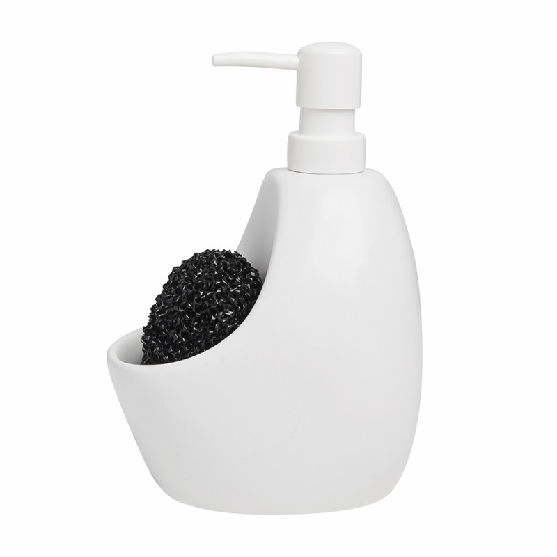 Мытье посуды — далеко не самое приятное занятие. Для тех, кто хочет покончить с ним побыстрее, предлагаем удобную конструкцию: керамический диспенсер с подставкой для губки. Моющее средство дозируется очень экономно через удобный длинный носик. Губка для мытья посуды входит в комплект. Объем 591 мл. Можно использовать в ванной, залив внутрь мыло, а в держатель положить баночку с кремом для рук, гибкую мочалку или другие мелочи. Дизайнер Sativa Turner.