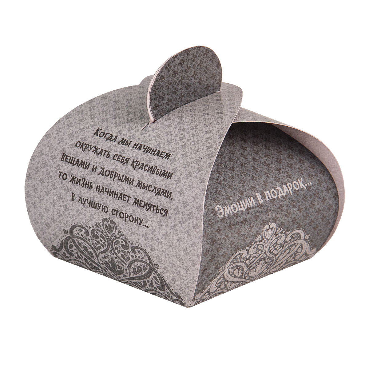 Подарок упаковывается в оригинальную коробочку. Надписи на коробке: «Эмоции в подарок...» «Когда мы начинаем окружать себя красивыми вещами и добрыми мыслями, то жизнь начинает меняться в лучшую сторону...» «Даже самый маленький подарок становится великим даром, если ты вручаешь его с любовью...» «Главные вещи в нашей жизни — не вещи...»
