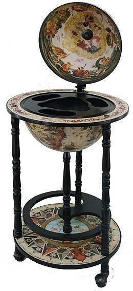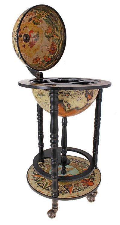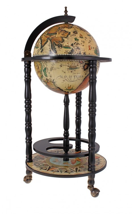 Напольный глобус-бар из коллекции ««Мировой океан»» выполнен в светлых пастельных тонах. Сфера глобуса декорирована копиями оригинальных карт XVII века. Внутри глобуса предусмотрено три отсека для хранения бокалов и один центральный отсек для напитков. Глобус-бар имеет устойчивую подставку. Все элементы изделия выполнены из натуральной древесины, фурнитура имеет защитное покрытие от преждевременных повреждений. Диаметр изделия 33 см. Поставляется в разобранном виде с инструкцией по сборке.