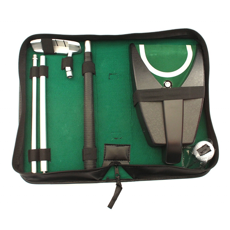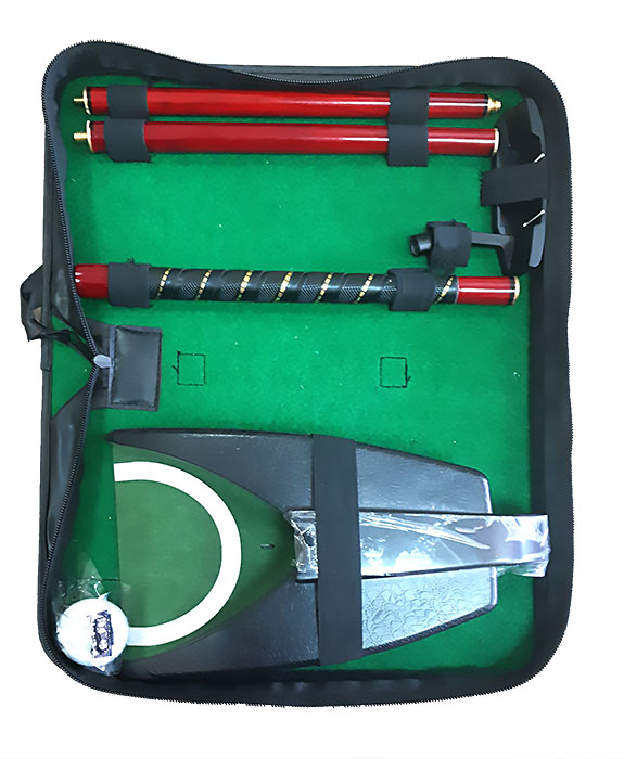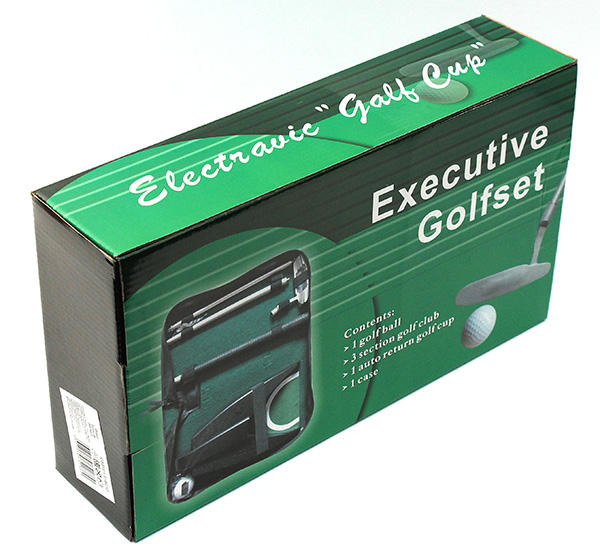 Компактные наборы для игры в гольф в помещении или на природе упакованы в элегантную сумку. Это делает набор не только стильным подарком, но и удобной для переноски вещью. Клюшка разборная, состоит из четырёх завинчивающихся частей. Лунка переносная, автоматическая. Имеет систему возврата мяча. При попадании в лунку, мяч тут же выстреливается назад, возвращаясь к игроку. Лунка работает от двух элементов питания типа R-14 С 1.5 V (в комплект не входят). Также в комплект входит один пластиковый мяч.