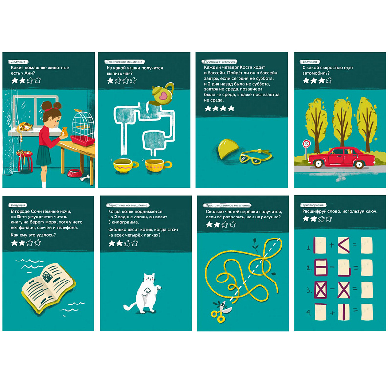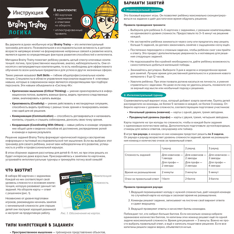В комплекте: 80 карточек, инструкция. На каждой карточке указан уровень сложности и основная компетенция, которую развивает данный тип заданий. На обороте карты — ответ с решением.