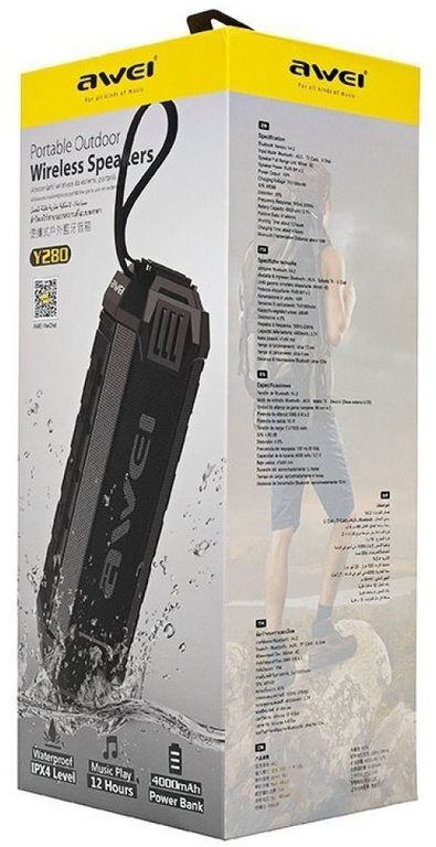 Мощная портативная колонка Awei Y280 поможет Вам устроить настоящую вечеринку дома, на пляже или на даче — там, где Вы этого захотите. Отлично подойдет для активного отдыха. Карабин на торце корпуса позволяет закрепить колонку на велосипеде или на руке. Подключайте ее к телефону через Bluetooth, вставляйте карту памяти или флешку, соединяйте аудио кабелем с компьютером и слушайте музыку 12 часов подряд. Колонка выполнена в крепком противоударном корпусе с покрытием soft-touch и защищена от брызг воды. Выдержит небольшой дождь или снегопад. А если необходимо, то заряжайте телефон прямо от колонки. Водонепроницаемость Портативная колонка имеет IPX4 степень влагостойкости. Конечно, сплав по горной реке она не выдержит, но небольшой дождик ей не страшен. Управление Все элементы управления расположены на верхнем торце корпуса колонки. Всего пять кнопок. Нажав на них, Вы сможете: включить или выключить колонку; синхронизировать ее с гаджетом; переключать треки; регулировать громкость; начать воспроизведение или поставить на паузу музыку; ответить на входящий звонок или отклонить его. Голосовые уведомления на английском языке известят Вас о включенном режиме. Аккумулятор Awei Y280 работает от аккумулятора емкостью 4000 мАч. Его полного заряда хватает на 12 часов активного использования. Можно устраивать вечеринку и наслаждаться музыкой всю ночь. Заряжается колонка около 4 часов с помощью USB-кабеля из комплекта. Кроме того, от колонки можно заряжать гаджеты. Выходная сила тока при этом равна 1 А. Подойдет для экстренной зарядки телефона, плеера или наушников. Подключение Awei Y280 подключается к мобильным устройствам через Bluetooth версии 4.2 с радиусом действия 10 метров. Кроме того, аксессуар поддерживает и другие способы подключения к носителям с музыкой. На тыльной стороне корпуса колонки под резиновой заглушкой расположены разъемы AUX, micro-USB и USB, а также слот для micro-SD карты. Когда смартфон разрядится, Вы сможете продолжить слушать музыку тремя способами: Вставить карту памяти или USB-флешку с любимыми треками. Включить режим FM-радио. Подключить колонку к любому гаджету с разъемом 3.5 мм посредством аудио кабеля.