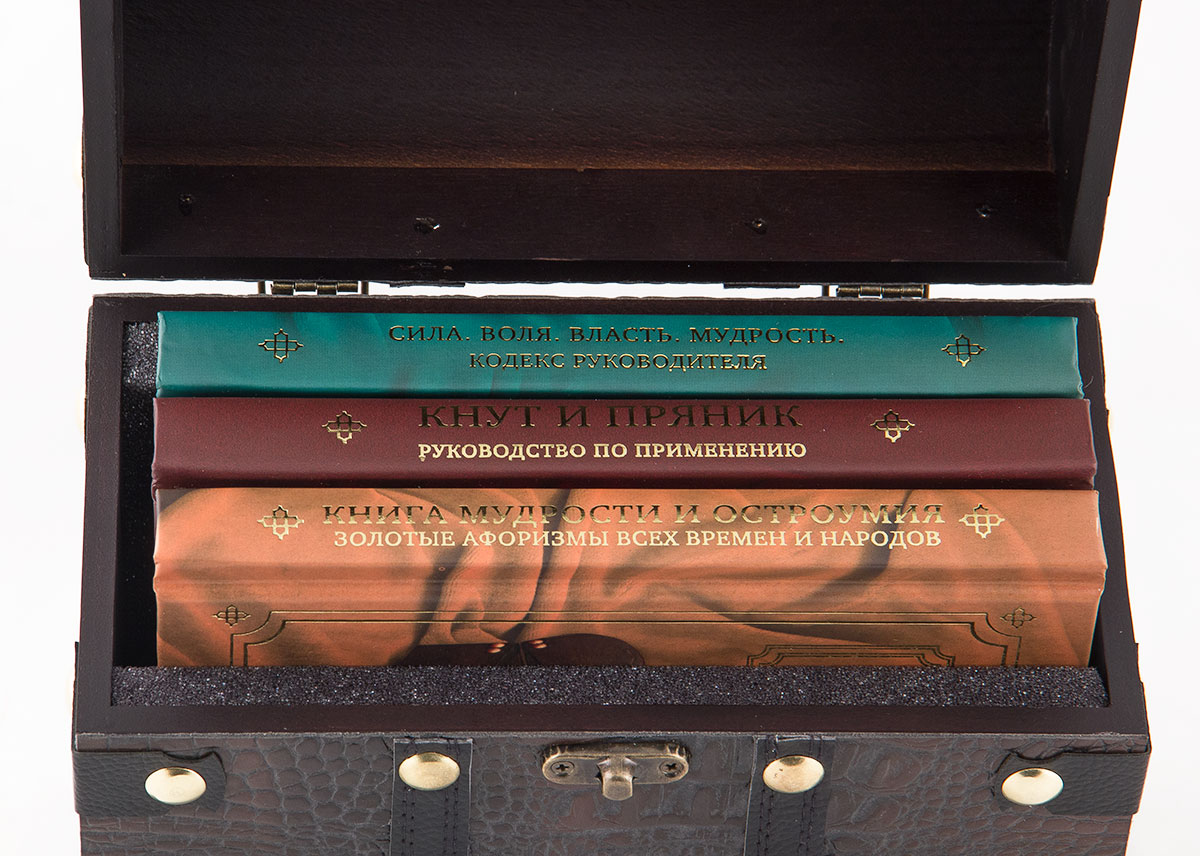 «Ларец с сокровищами» — оригинальный подарок сильному, решительному, харизматичному, успешному и нацеленному только на победу лидеру. «Сокровища», собранные в этом ларце, вдохновят руководителя на новые проекты, сделают бизнес более эффективным, помогут понять, как вести людей к победе, как приспосабливаться к изменяющимся условиям и как лучше взаимодействовать с разными людьми.