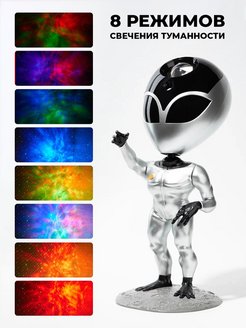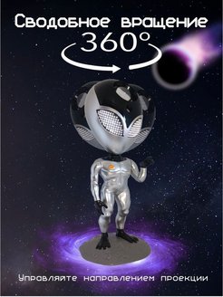 Уникальный лазерный ночник проектор звёздного неба «Инопланетянин» — это — отличный декор комнаты, — интересная для ребёнка фигурка игрушка, — мощный светильник проекция космических туманностей и звездного неба, — ночник с подсветкой глаз, — «повторюшка»: в режиме голоса он записывает вашу речь и повторяет ее. Домашний лазерный проектор мощнее обычных светодиодных проекторов, а значит изображение, исходящее из головы нашего «Инопланетянина» будет ярче, чётче, мощнее. Регулируйте положение головы пришельца и направляйте свет, куда вам нужно, все настраивается под ваши предпочтения. Проекция космической туманности и звёзд управляется как с пульта, так и с кнопок на самом светильнике звёздного неба. Вы сами устанавливаете яркость, скорость движения, динамическое или статическое движение. В комплекте идёт пульт, который позволяет вам управлять RGB проектором «Инопланетянин» не вставая с места, что очень удобно, если вы хотите поменять режимы. Лазерный звёздный проектор служит также ночником. Вы можете оставить включёнными только глаза Инопланетянина, которые мягко будут подсвечиваться в темноте. Спать вы будете под защитой вашего маленького друга. Уникальный дизайн проектора подойдёт как комнате ребёнка, подростка, так и комнате взрослого человека, интересующегося фантастикой или просто вдохновленного необычной формой светильника. Поверьте, ваши гости с восторгом будут спрашивать, что же стоит у вас на полке! Таймер отключения будет удобен, если вы хотите уснуть в окружении космических туманностей. Установите время на 1 час или на 2 часа, и Инопланетянин сам отключится. Весёлая функция управления голосом. Включите эту функцию, и Инопланетянин будет повторять любые звуки, которые вы произносите. Появляется ощущение, что маленький пришелец разговаривает с вами. Отзывы покупателей доказывают, что такой светильник всегда будет в центре внимания на вашей вечеринке, украсит уютный вечер за просмотром фильма, восхитит детей и взрослых, станет весёлым ночником, забавой с повторением голоса, будет отличным фоном ваших видео и фото. Равнодушных нет! Внимание! Ознакомьтесь с инструкцией в коробке, чтобы обеспечить правильное безопасное использование лазерного проектора звёздного неба.