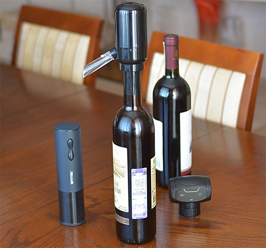 Электронный аэратор-помпа для розлива и аэрации вина. Делает процедуру дегустации вин максимально комфортной. Благодаря удобному носику у вас нет ни единого шанса пролить вино, ведь вам даже не нужно наклонять бутылку. Аэрация происходит мгновенно, в процессе розлива в бокалы. Компактный насос осуществляет перекачку вина из бутылки в подставленную вами емкость. В саму бутылку погружается длинный стержень, полый внутри. Для начала процесса аэрации и розлива сдвиньте переключатель на носике в положение «ON» и нажмите кнопку на верхнем торце устройства. Электронная вакуумная пробка для бутылок. Автоматически откачивает из откупоренной бутылки с вином воздух, чтобы оставшийся напиток дольше оставался свежим. Вакуумная пробка будет контролировать давление воздуха внутри бутылки и при необходимости запускать процесс откачки воздуха. Прибор оснащен датчиком опрокидывания с целью предотвращения разлива вина. Когда винная бутылка наклоняется до 45°, процесс откачивания воздуха прекращается, а при возвращении вертикального положения — возобновляется. Универсальный цифровой термометр-браслет. С его помощью вы сможете измерять температуру напитка даже в полностью закрытых бутылках в очень широком диапазоне — от -9 до +70 °C. Термометр легко зафиксировать на любой бутылке диаметром до 8 см, он полностью автономен, так как питается от батарейки.