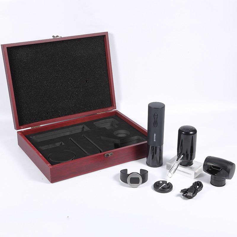 Подарочный набор для вина «SITITEK E-Wine Black Edition» состоит из 5 полезных аксессуаров: электрический штопор, аэратор-помпа, электронная вакуумная пробка, нож для срезания фольги и цифровой термометр. Все элементы набора отличаются стильным дизайном и черным цветом корпуса. Поставляется в кейсе из натурального дерева.