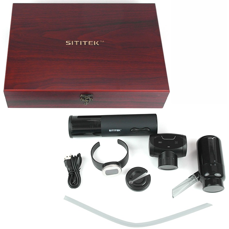 Преимущества винного набора «SITITEK E-Wine Black Edition»: 5 полезных инструментов в одном наборе. Предлагаемый комплект включает простой в применении электрический штопор, аэратор-помпу для автоматического розлива вина и одновременного насыщения его кислородом, электронную вакуумную пробку для закупоривания бутылок, универсальный цифровой термометр, измеряющий температуру напитков даже в закупоренной таре, а также нож для срезания фольги.