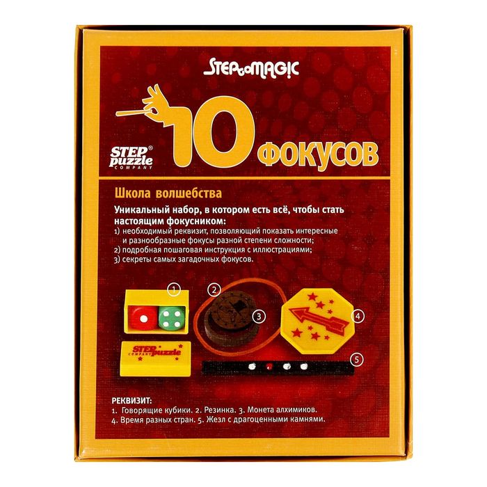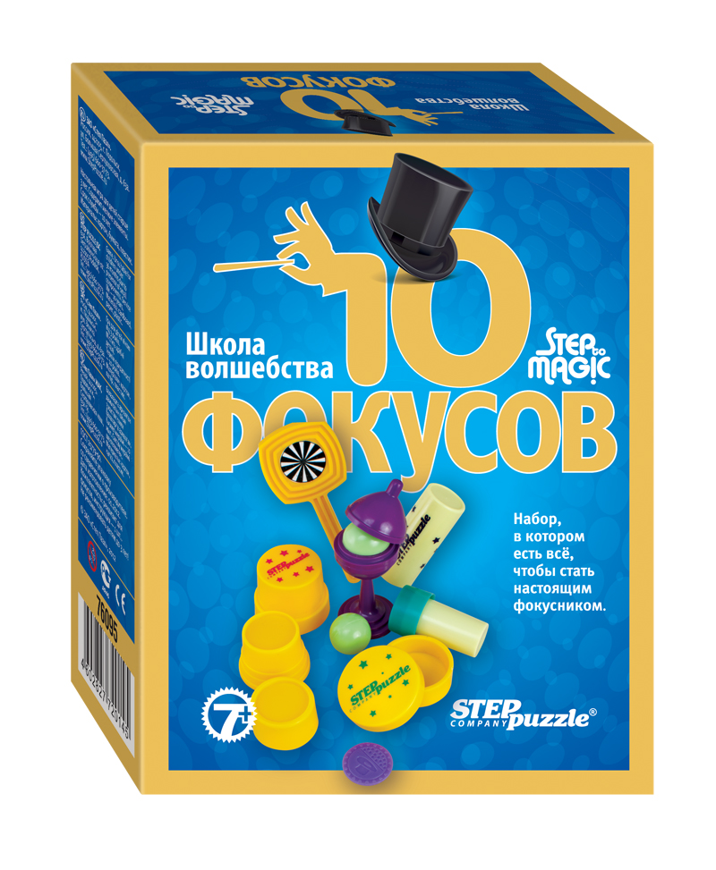 10 фокусов от компании Step Puzzle — это потрясающий игровой набор из серии Школа волшебства, который не оставит равнодушным ни одного юного фокусника. Обучение фокусам развивает у ребёнка внимательность, аккуратность, понимание многих физических процессов. Демонстрация фокусов помогает научиться сценическим выступлениям, способствует развитию коммуникативных способностей у ребёнка, придает уверенность в своих действиях. В процессе тренировок фокусов развивается мелкая моторика рук и абстрактное мышление. В комплект входят различные предметы, при помощи которых ребенок самостоятельно сможет устроить 10 различных фокусов. Также в набор входит подробная инструкция, которая поможет ребенку во всем разобраться.