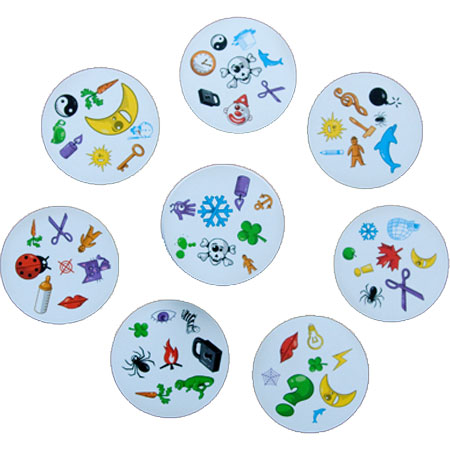 Вариант игры 1: «Адская башня» Карты тасуют, после чего выкладывают по одной карточке перед каждым игроком рубашкой вверх. Остальные карточки кладутся в центр стола рубашкой вниз. Затем игроки переворачивают свою карточку картинкой вверх и игра начинается! Первый, кто найдет на карточке в центре тот же символ, что и на его, получает карточку себе. Игра продолжается, пока в центре не остается карт. Победителем считается тот, кто набрал больше всего карт.