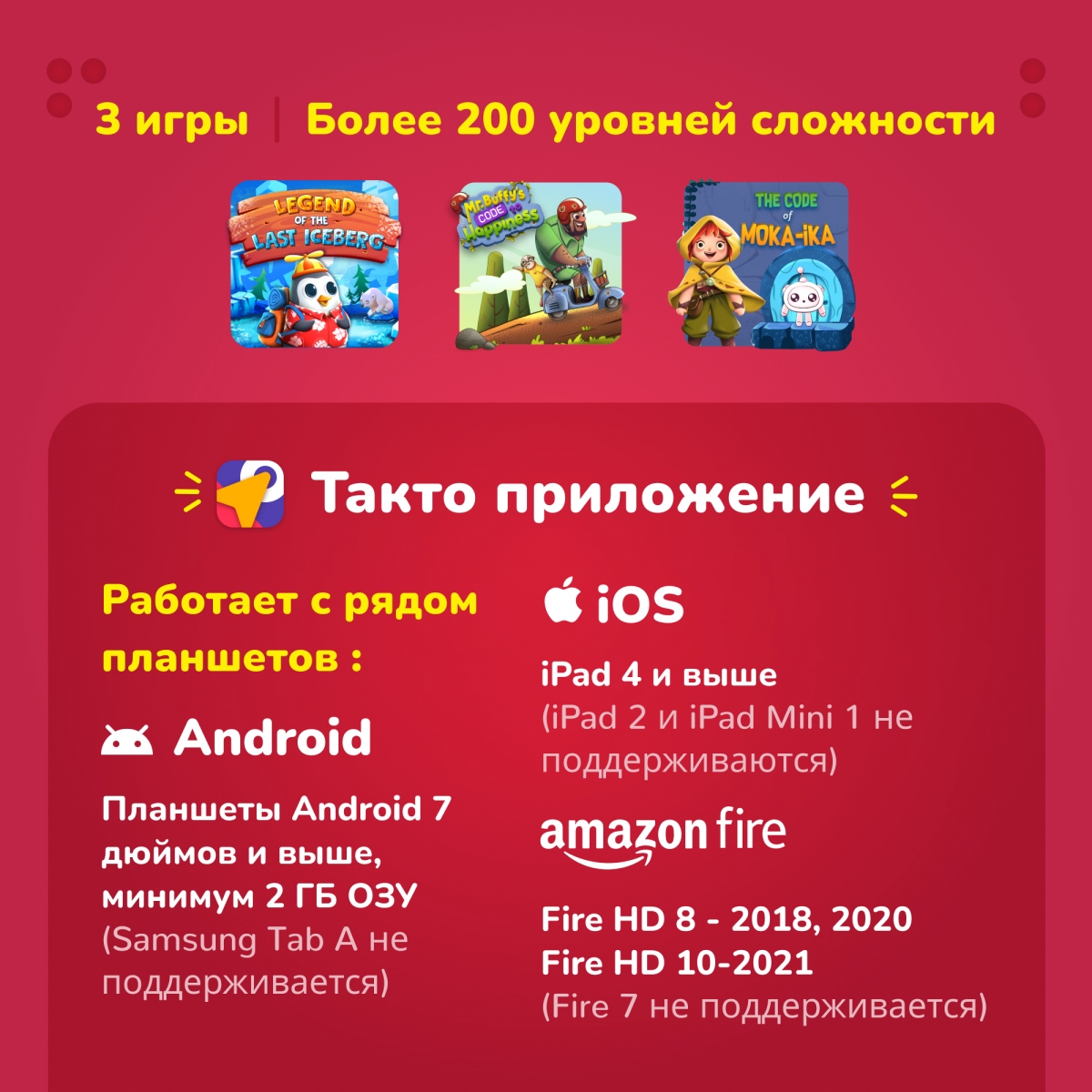 Игра Tacto Маршруты научит вашего ребенка понимать, как, выполняя различные задания и отдавая команды в правильном порядке, он может продвигаться вперед, следуя алгоритмам логики. Это первый шаг к обучению программированию, и с помощью Tacto Маршруты ваш ребенок также может попробовать и освоить язык кода Scratch, который позднее сможет использовать для многих других занятий на обычном компьютере.