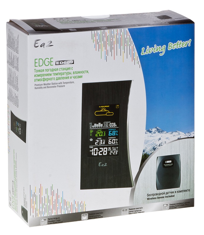 Беспроводной датчик: * Передает сигнал на расстояние до 30 м. * Замеряет температуры от -40 до +60 градусов Цельсия * Питается от 2-х ААА батареек. *Адекватный прогноз формируется спустя 6 часов после включения девайса и действителен в радиусе 30 км от месторасположения устройства.