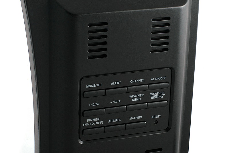 - Задняя сторона содержит 11 кнопок управления с коротким, четким, упругим ходом, отверстия динамиков, выход для сетевого адаптера и подставку, скрывающую отсек для батареек.