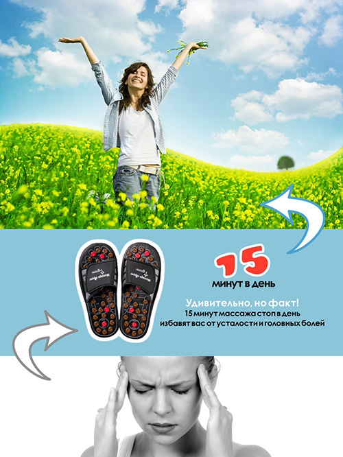 Известно, что очень большое количество активных точек (примерно десятая часть), отвечающих за внутренние органы человека, находится на ступнях его ног. И поэтому для того, чтобы правильно воздействовать на эти точки необходимо точно знать, где расположена и за какой именно орган отвечает та или иная зона на стопе. При помощи рефлекторных тапочек Вы без особых знаний и навыков проведете приятный и полезный массаж акупунктурных точек. Этим Вы поспособствуете улучшению кровоснабжения, выведению токсинов, снимите стресс и нервное напряжение. Даже если Вы абсолютно здоровы, не откажите себе в удовольствии получить массаж ступней в любое удобное для Вас время. Рефлекторные массажные тапочки очень удобные, и поэтому их можно носить не только дома, но и на улице. Преимущество рефлекторного массажа заключается в обеспечении индивидуального акупунктурного воздействия, восстанавлении энергетического баланса, стимулировании работы всех органов и систем организма. Тапочки имеют высокую прочность, их легко мыть и просушивать. С помощью рефлекторных тапочек Вы за короткое время добьетесь улучшения состояния Вашего здоровья.