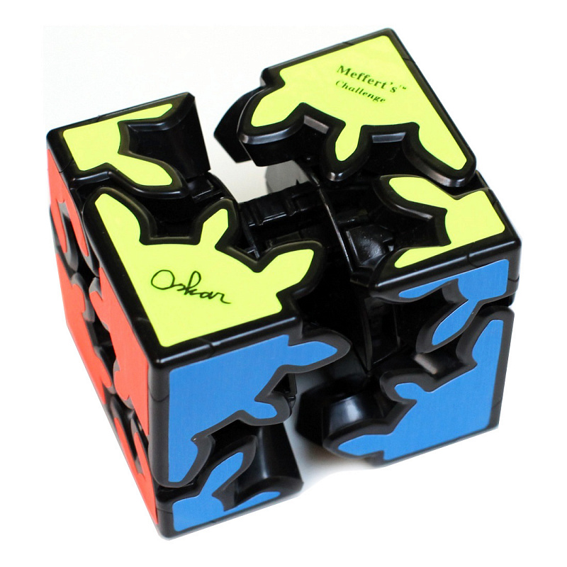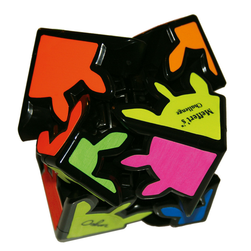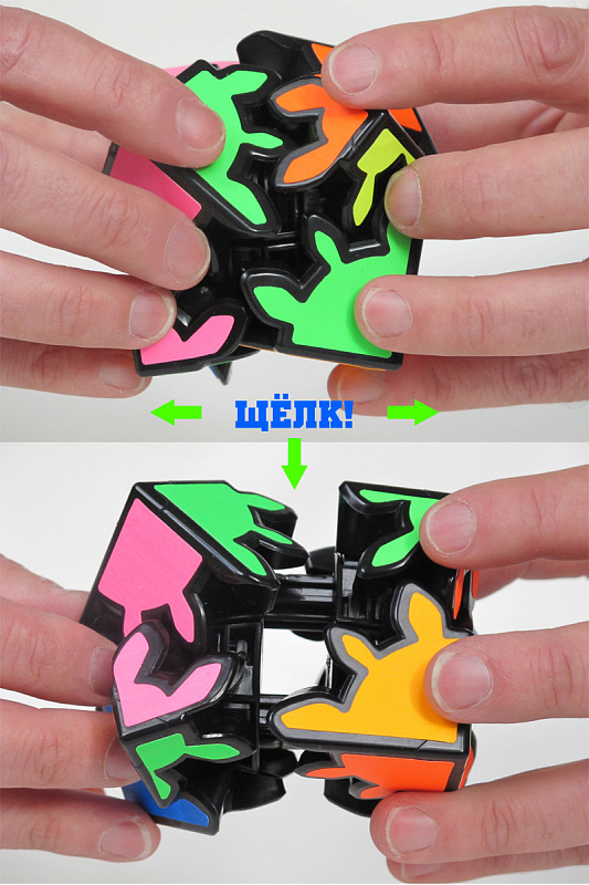 Восемь шестеренчатых элементов этой головоломки расположены по углам так, что поворот любого из них автоматически вращает все остальные элементы. Это полная неразбериха и царство хаоса, но ровно до тех пор, пока головоломка не покажет вам свой секрет — спрятанный во внутренней части механизм, позволяющей кубу раздвигаться в стороны, разъединяя зубья элементов. Два характерных щелчка и куб разделился на 2 половины, по 4 элемента-шестерни на каждой. А теперь представьте, что раздвижной механизм работает поочередно во всех 3 плоскостях! Дальше — дело техники: создавая, вращая и меняя группы из 4 связанных шестеренок каждой из половинок, необходимо собрать каждый цвет на своей стороне.