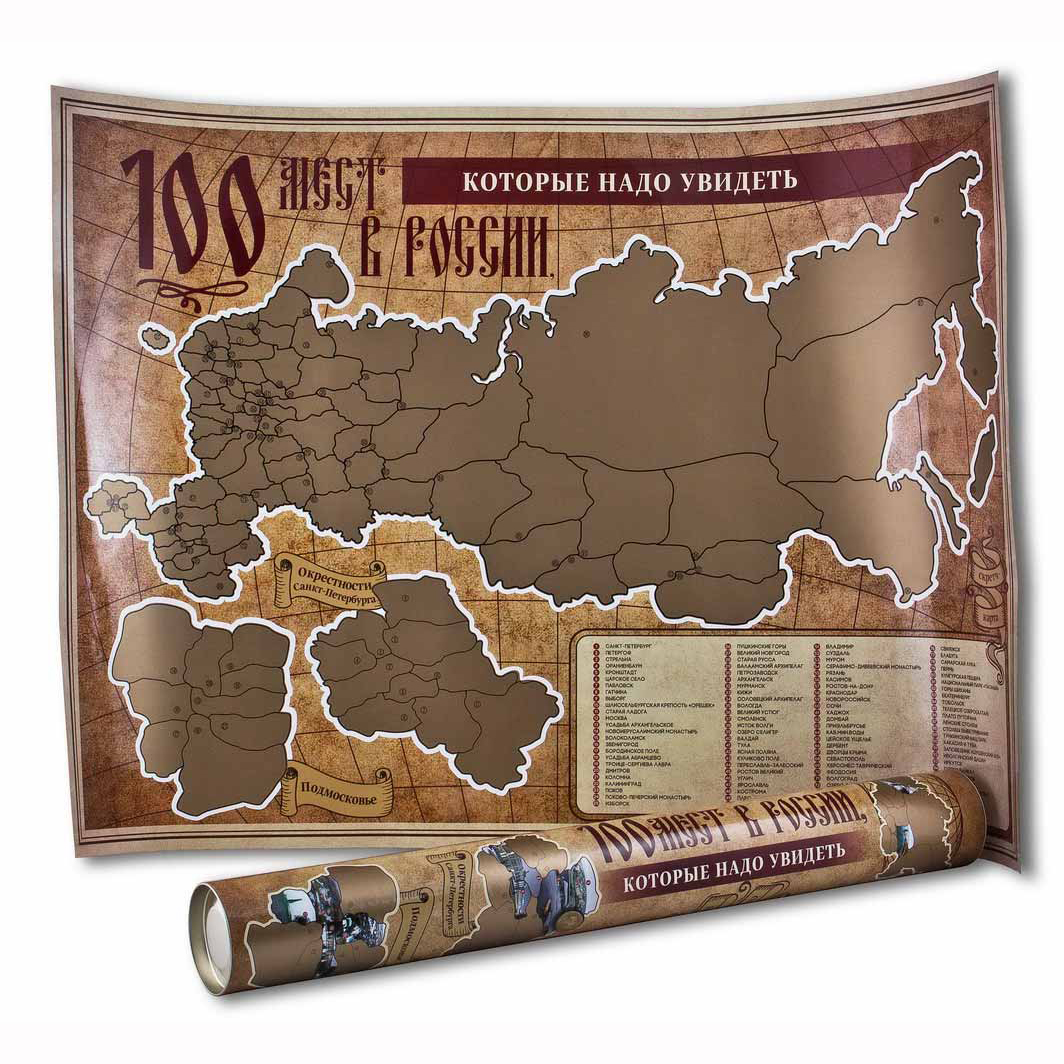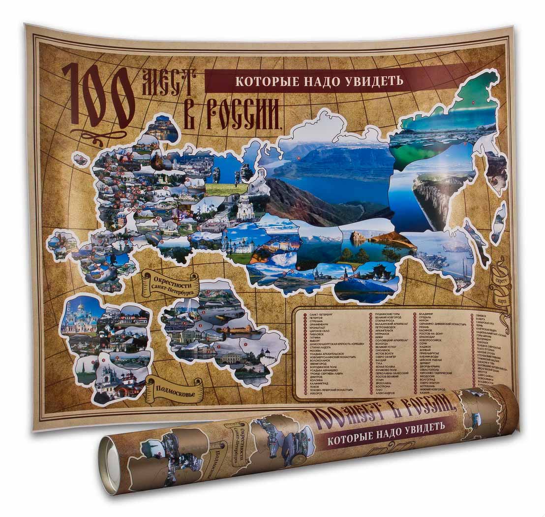 На карте «100 мест в России, которые нужно увидеть» покрыто защитным золотистым слоем. На ней очень удобно и забавно отмечать места, в которых Вы уже побывали. Для этого нужно стереть монеткой покрытие, соответствующее этой территории, чтобы увидеть картинку основной достопримечательности этого места. Неизвестная территория пусть останется под защитным слоем, но ненадолго, только до следующей поездки. Пусть это станет приятной и веселой традицией после отпуска.