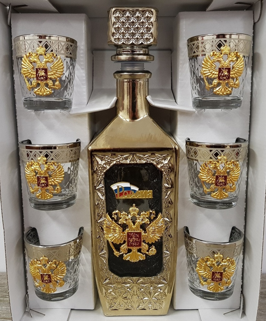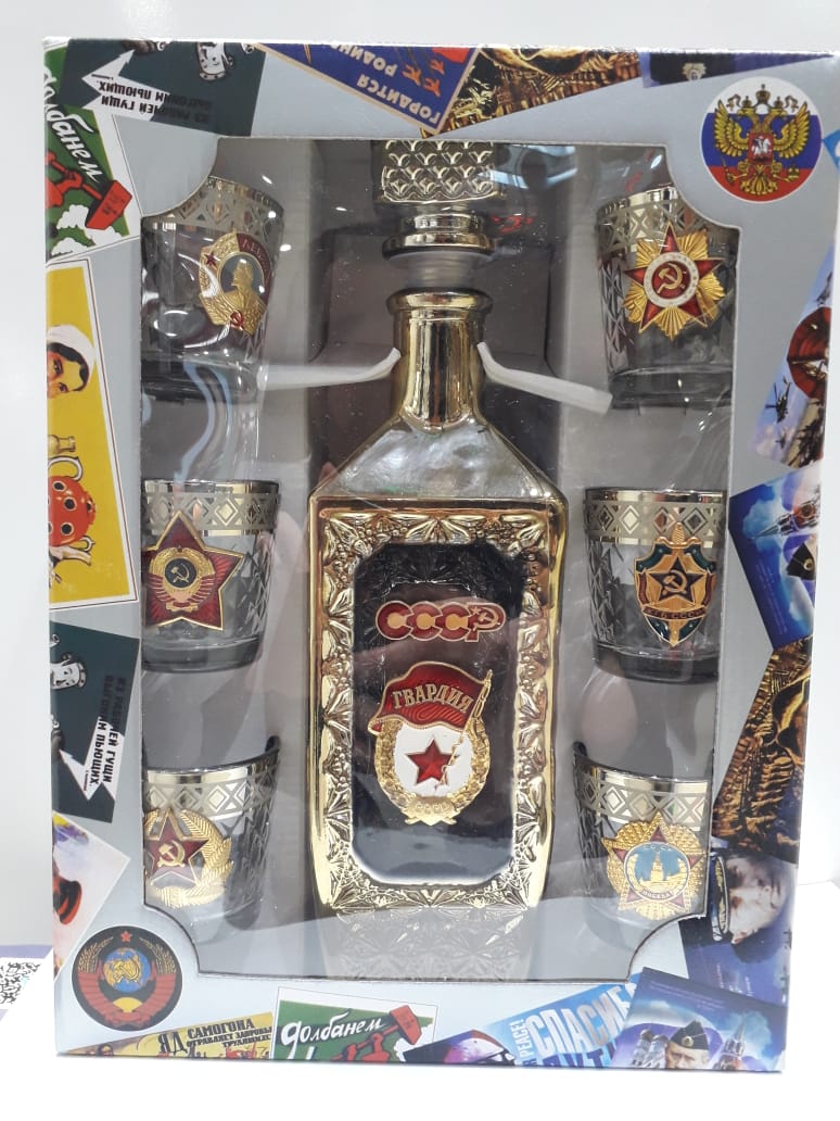 Набор из графина и 6-ти стопок с эмблемами СССР и герба РФ, станет приятным подарком для любого мужчины, и который также приятно украсит любое застолье. Состав: стекло В набор входит: штоф: 1 шт -0,5 л рюмки: 6 шт- 50 мл